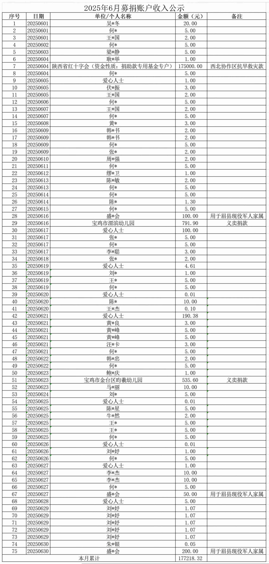 2025年6月募捐账户收入公示