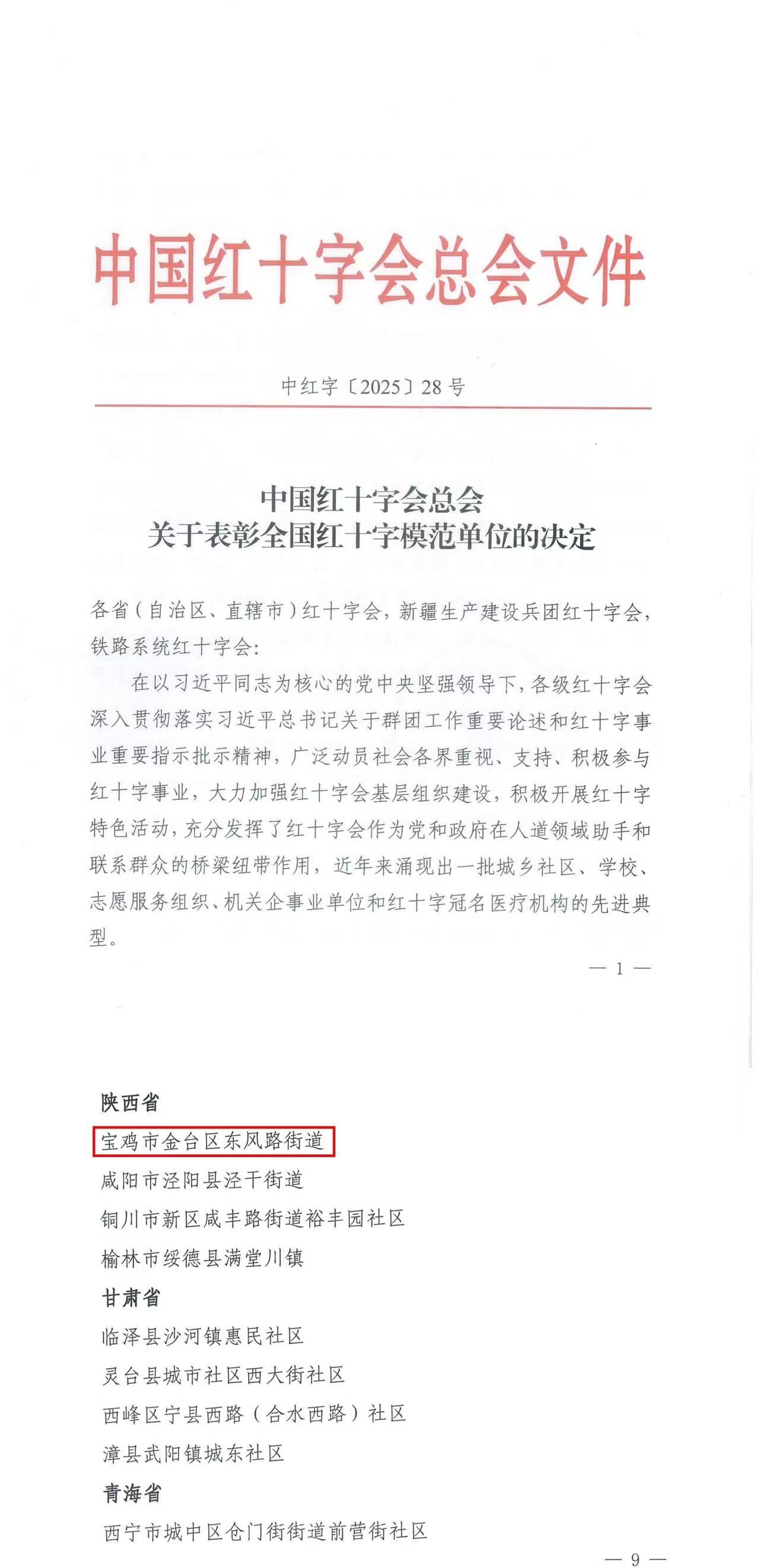 近日 ,中国红十字会总会印发《关于表彰全国红十字模范单位的决定》,授予全国范围内369个城乡社区、学校、红十字志愿服务组织、机关企事业单位、冠名红十字医疗机构“全国红十字模范单位”称号,我市金台区东风路街道榜上有名!