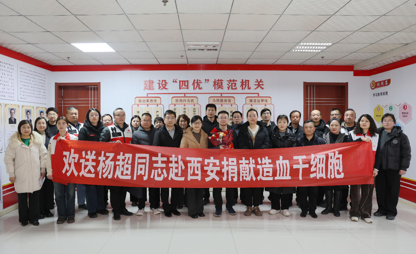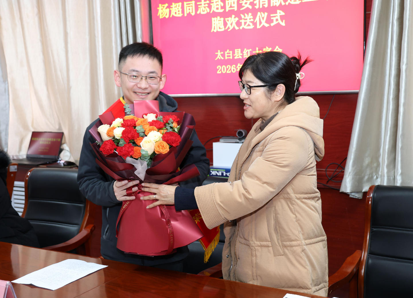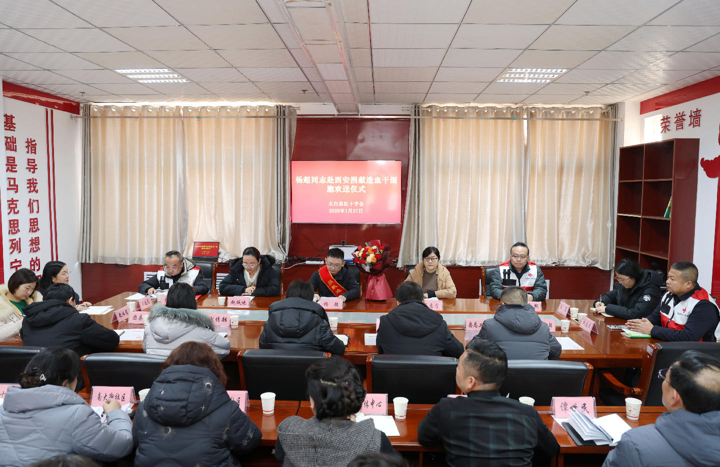 1月27日下午,太白县红十字会举行全县首例造血干细胞捐献志愿者杨超赴西安捐献欢送会,为即将启程的爱心使者送上祝福与敬意。宝鸡市红十字会常务副会长、县政府副县长出席会议。太白县咀头镇、王家堎镇、县委宣传部、社工部、县卫健局、县教体局、县总工会、团县委、融媒体中心、东大街社区、南大街社区和部分理事、监事及县红十字会全体人员参加欢送仪式,共同见证这一温暖时刻。