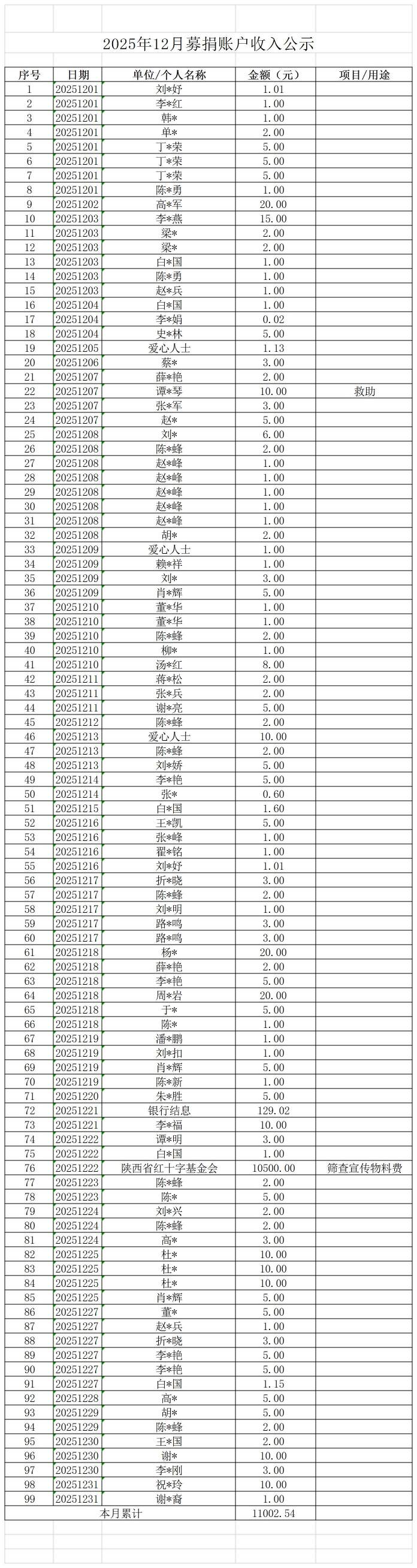 2025年12月募捐账户收入公示