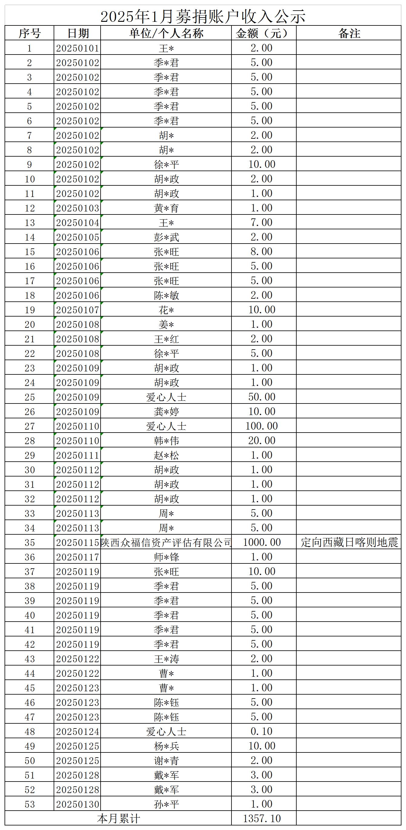 2025 年 1 月募捐账户收入公示