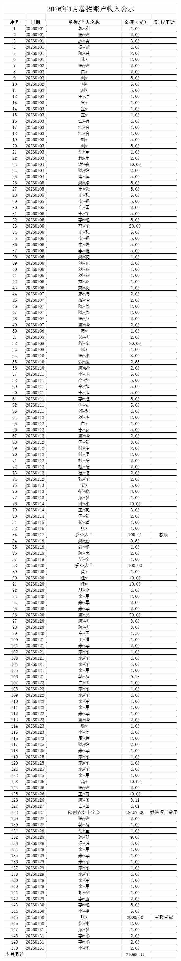 2026年1月募捐账户收入公示
