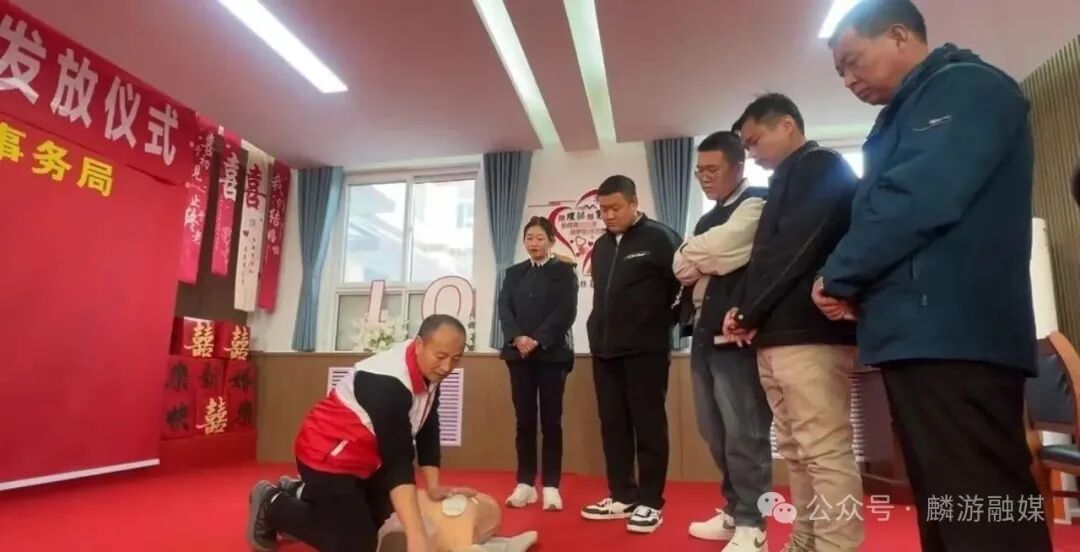 发放仪式结束后,县红十字会应急救救护培训师资采取理论讲授和实操演示相结合的办法,为受赠单位干部职工现场培训了心肺复苏(CPR)和AED实操技能,系统讲解了心脏骤停的识别、呼救方法、胸外按压、人工呼吸以及AED使用流程,并手把手指导、帮助大家掌握心肺复苏与AED使用的核心要领。